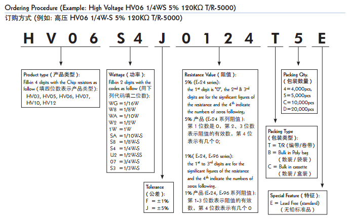 根據功能用途不同表達型號方式也有區別,如厚聲的高壓厚膜晶片電阻,型號以字母開頭HV03, HV05, HV06, HV07,HV10, HV12。